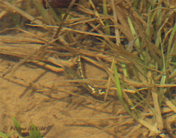 Malheureusement elle finit par se diriger vers les grosses touffes d'herbe, se glisse en dessous et je la perds de vue. J'attends, le mâle aussi, deux minutes, personne. C'est difficile de distinguer bien le fond, l'eau est un peu boueuse. Je vois remuer dans les herbes encore de temps en temps et la devine puis une dernière fois un mouvement et plus rien.