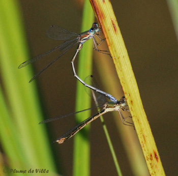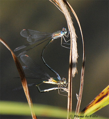 d'iris d'eau, un couple de Lestes verdoyants. Ils sont fins et