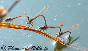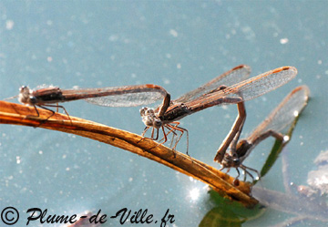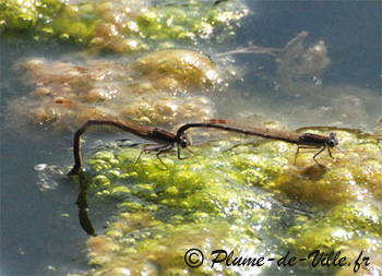 Des dizaines de couples de lestes en tandem au-dessus de la mare cherchent la meilleure place pour pondre. Ils volent au-dessus des brins d'herbes et des branchages le long du rivage, font du sur place, zigzaguent, puis descendent vers l'objet de leur choix. Quelques solitaires les croisent.