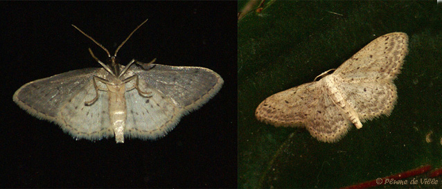 La petite phalène toujours présente (La Vieillie Idaea seriata.) nous montre, posée sur la vitre, son ventre beige (agrandir).