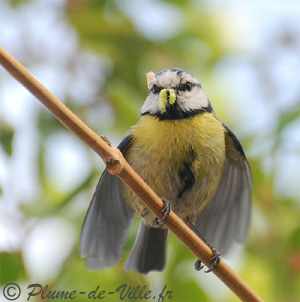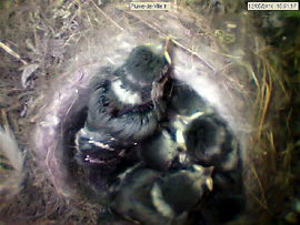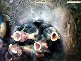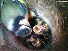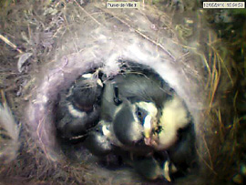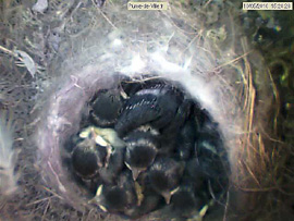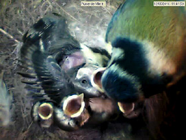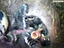 They already beat the wings. At least the one that I call super-tit, much more developed than the others. Always the first to eat. He leaves the bowl, fidgets, continuously disturbs everyone. The centre of the nest is well hollowed, there is an overhang under witch one or two chicks disappear sometimes. Some younger, still have their small stiff feathers on the head, just behind the racoon black mask. The more developed have lost them.
