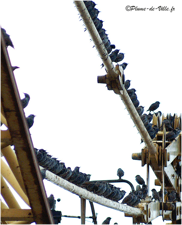 Avant d'aller au dortoir, ils se rassemblent, ici sur une grue, où ils se sont posés régulièrement en octobre et novembre. Ils aiment les sites élévés.