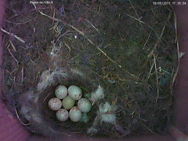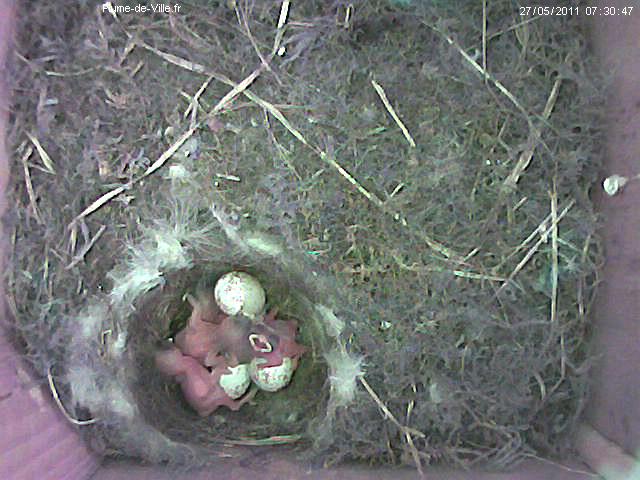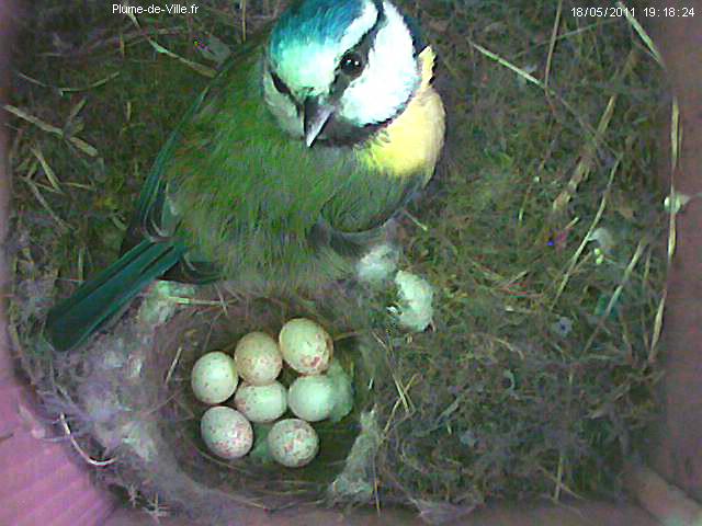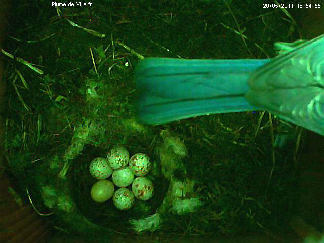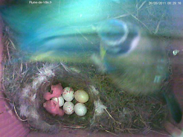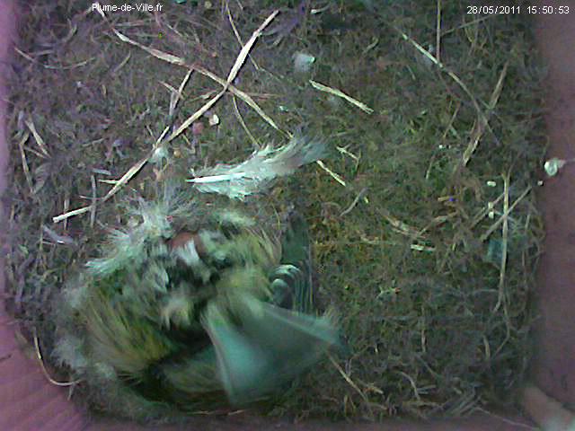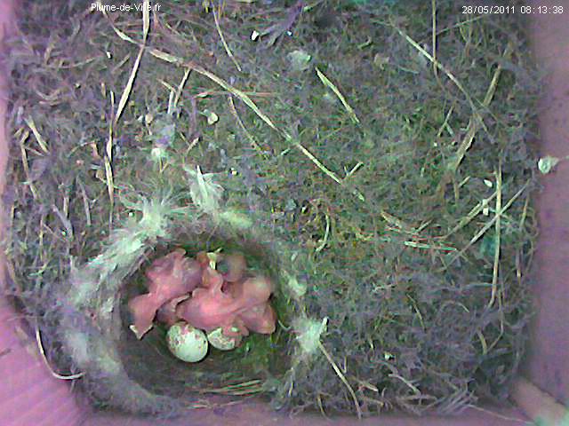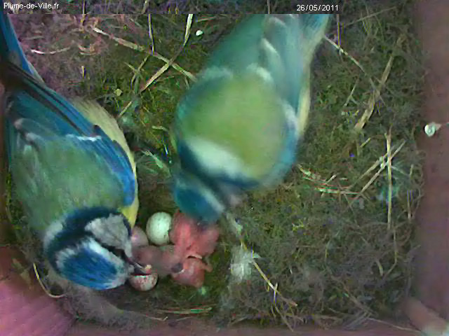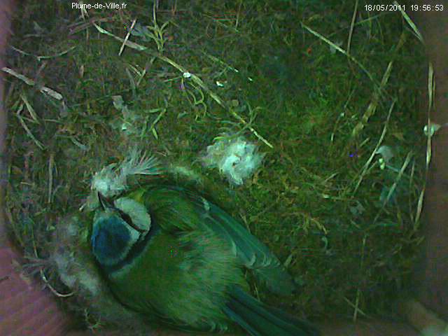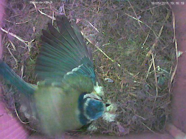 A 4h40 on voit la mère se lever, inspecter la coupe du nid et finir par sortir une demi- coquille.
