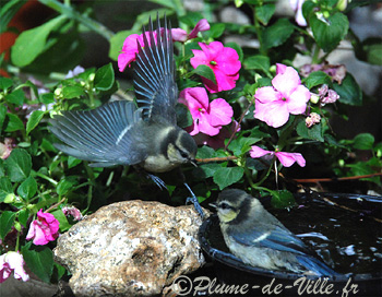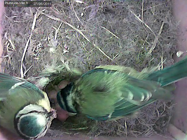 La mère réagit immédiatement, sort et aussitôt, une violente bagarre s'engage, le père venant à la rescousse. Quatre mésanges imbriquées dégringolent à terre. Impressionante la violence de ces acrochages. Les charbo finiront par décrocher et s'envoler.