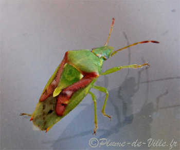 Voila pas mal d'années que je ne la voyais pas, cette punaise colorée, une gourmande de baies de genévriers. Elle est posée sur la vitre à l'extérieur.