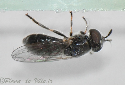 Ce petit syrphe tout noir est un habitué, il apparaît régulièrement depuis des années faisant les cents pas sur la vitre à l'intéroeur, attendant que je lui ouvre.