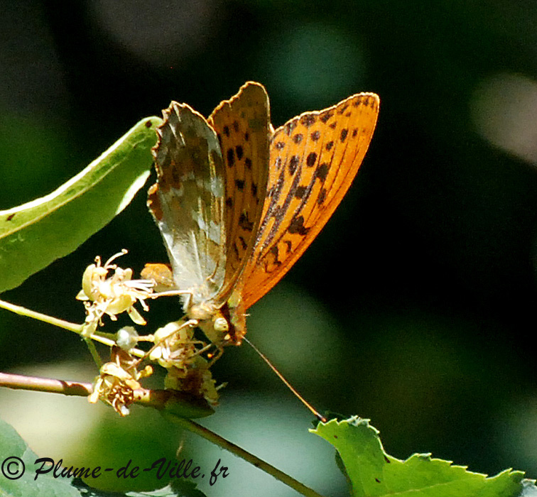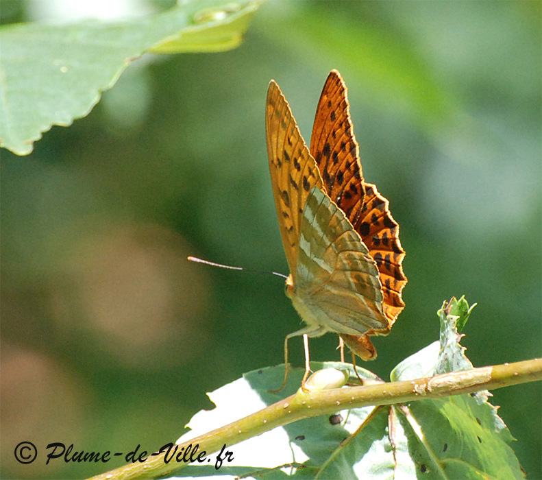 Mâle avec ses longues stries sombres sur l'avers de l'aile que l'on entrevoit à droite et les stries argentées sur fond vert, de son revers qu'il m'a accordé de voir.