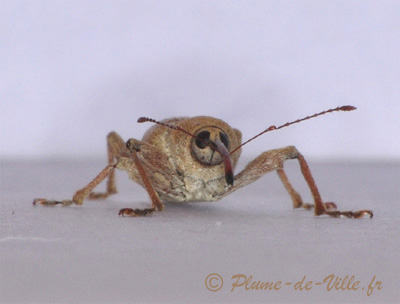 C'est un Charançon, étrange avec sa longue trompe proéminente (le rostre), ses antennes fichées bizarement au milieu et ses pièces buccales au "bout du nez" (à l'extrémité du rostre).