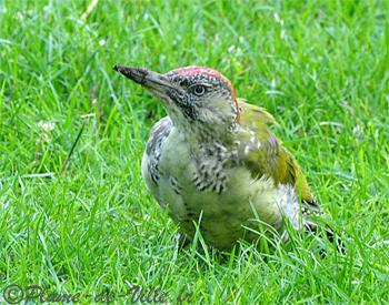 Pic-vert trou l'herbe avec son long bec, que l'on voit plein de terre.