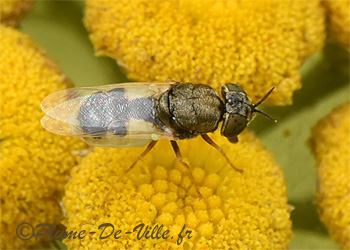 Sur la Tanaisie se nourrit goulûment un diptère au large abdomen d'opale, traversé d'un dessin noir très graphique.