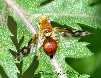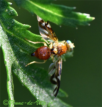 Fin septembre, une ravissante mouchette danse sur une feuille, agitant en rythme ses ailes, elle avance d'un côté, regarde, fait demi-tour et recommence de l'autre. C'est une Téphrite, une "Mouche des fruits", cette belle rousse est la Mouche du céleri.
