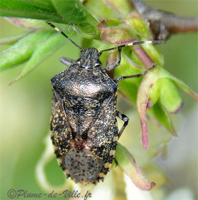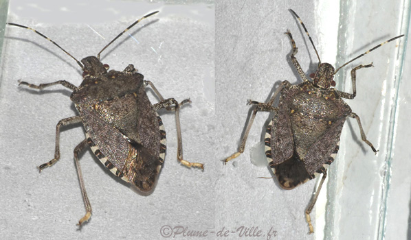 Je l'ai, au premier abord, confondue avec une autre, la Punaise nébuleuse (Rhaphigaster nebulosa) que je vous présente par la suite. Mais les deux petits points orangés de l'écusson m'ont fait chercher un peu plus loin. Les antennes, les hémélytres, les points jaunes, et l'absence d'épines sous l'abdomen font alors vite arriver chez Halyomorpha halys.