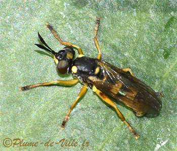 Noir et jaune comme Conops mais avec un "museau" jaune moins proéminent, une tache noire sur le fémur 3 mais ce n'est pas un anneau qui en fait presque le tour.
