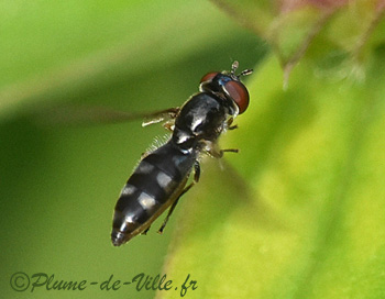 Un syrphe noir qui aime rester suspendu en vol stationnaire pour choisir sa fleur préférée.
