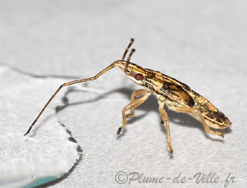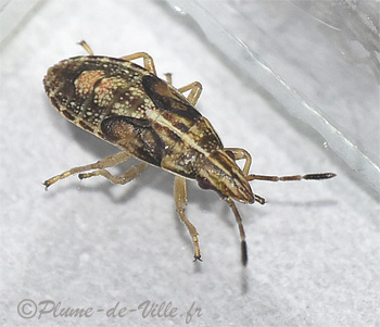 C'est encore une punaise invasive, d'origine nord-américaine, détectée pour la première fois en 2008 en Corse, en 2009 en Espagne (Barcelone), on ne sait pas comment elle est arrivée. Elle est adepte des platanes... comme le Tigre des platanes. Elle est peut-être aussi ravageur, on ne le sait pas encore, ce n'est pas le cas dans le milieu naturel des arbres. Et c'est sûrement avec ma récolte d'écorces de platanes, lieu d'élections des Tigres présentés au début de ce mois, qu'elle est arrivée à la maison bien cachée!