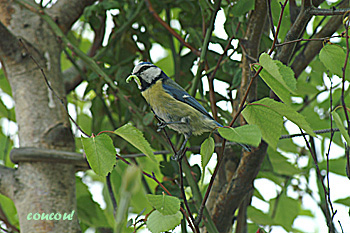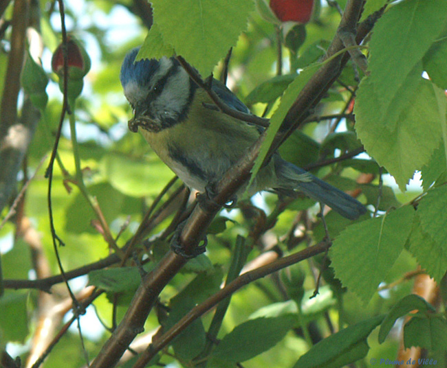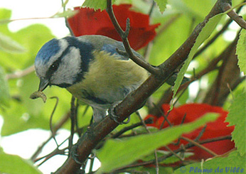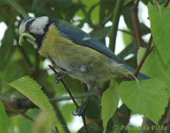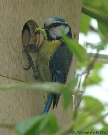 La chasse est bonne. Plus tard dans la journée, le voilà avec une chenille. Comme d'habitude il appelle. Mais pas de réponse, alors il tend le cou pour regarder dans le nichoir. Il tient sa chenille tout à la pointe de son bec.