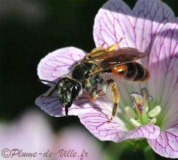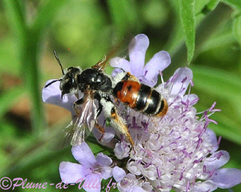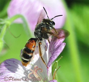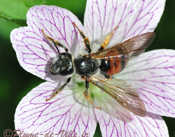 C'est une très belle abeille qui se décline en deux teintes! Une forme a l'abdomen noir et l'autre forme, comme ici, a les tergites 1 et 2 marqués de rouge. Sur la photo du dessus on voit que le sternite 2 l'est aussi.