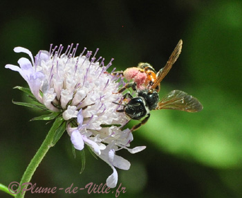 Un peu plus loin, affairée sur une autre fleur, cette autre a butiné du pollen blanc. Autre espèce de Scabieuse?