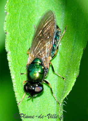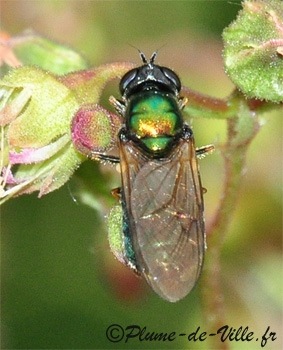 Elle est de la famille des Stratiomyides, les "mouches soldats".C'est une mouche à l'abdomen aplati qui