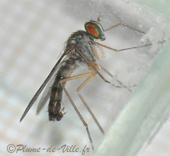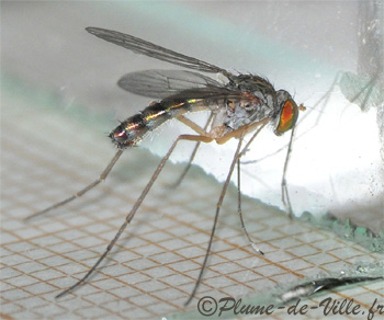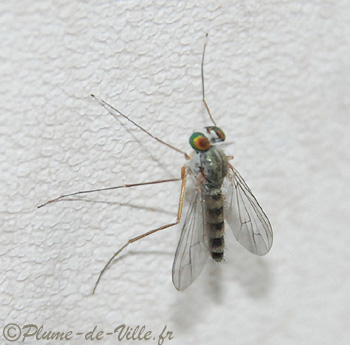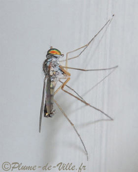 Non, ce n'est pas un moustique malgré son allure et ses longues et fines pattes, mais une inoffensive petite mouche de la famille des Dolichopodides, qui ne vous fera aucun mal. On peut aisément la confondre car elle reste aussi posée sur les murs à la verticale.