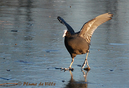 La Foulque macroule s'aide de ses ailes sur la glace, surtout si elle