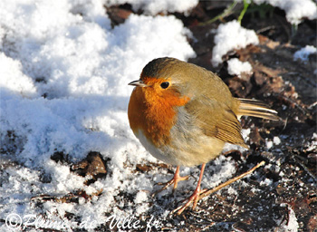 Par temps de neige il s'approche souvent de nous, confiant, les plumes bien gonflées. En balade, j'ai toujours quelques miettes dans les poches, le cadeau déposé, il sait vite le repérer et l'apprécier.