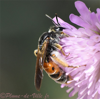 Elle est amusante à voir butiner car elle lève son abdomen en arrière un peu comme les Megachiles. Pour celle-ci ce n'était pas très typique. Mais en voici d'autres, rencontrées il y a deux ans qui pratiquaient ainsi. On en voit également d'autres chargées du rose pollen des Knauties: l'Andrène de la Scabieuse,