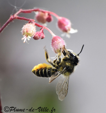 Très affairée sur les minuscules fleurs de l'Heuchère marmelade une délicate abeille à la jolie brosse passe de fleur en fleur.