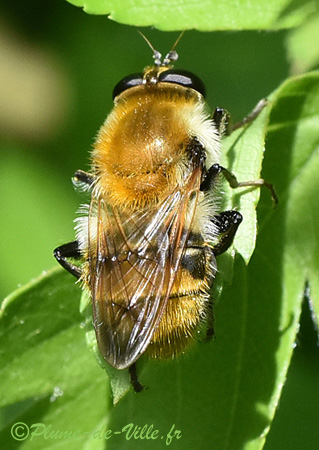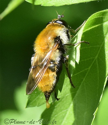Avril, une grosse "mouche" fourrée, dorée et bien dodue se chauffe au soleil sur une feuille d'arbuste.
