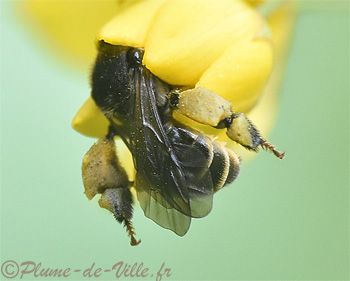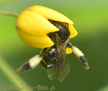 Plongée tête la première dans la fleur, elle lève ses deux pattes arrière bien haut. Cette petite abeille noire est de la famille des Melittidés.