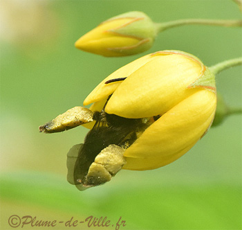 Dans la profusion d'or de la Lysimaque (Lysimachia vulgaris), une sombre abeille a une méthode bien amusante de butiner.