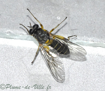 Grosses cuisses (fémurs postérieurs) jaunes (voir la photo des dessous...). Balanciers jaunes. Abdomen noir rayé de jaune. Scutellum jaune. Thorax noir, "cabossé". Les yeux sont séparés chez le mâle comme chez la femelle. Il me semble bien que celle-ci est une femelle.