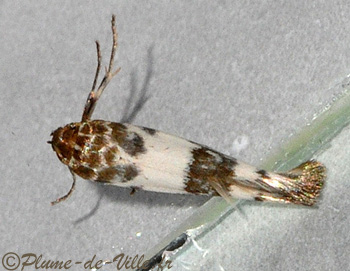 En ce mois de juin, sur la vitre se tient un microlépidoptère joliment habillé de blanc soyeux et de brun. Une invitation plus tard, il pose calmement pour son portrait.